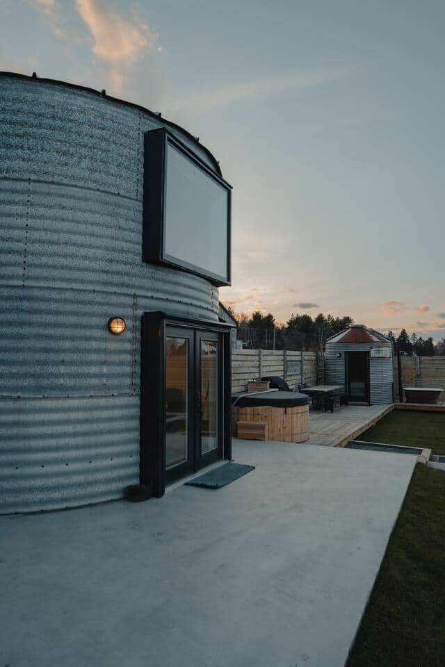 This 18-foot silo located on our farm boasts a cedar sauna and hot tub, an outdoor shower, a smokeless fire pit, a propane pizza oven, an outdoor kitchen, and an outdoor movie theatre for unforgettable summer nights.